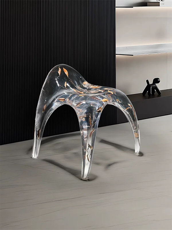 This custom Transparent Resin Sculptural Chair is a high-end piece that combines contemporary artistic expression with functional furniture. The chair features an organic, flowing sculptural form, crafted as a single piece from high-quality transparent resin, with natural botanical elements embedded inside, creating a visual sense of growth and nature.