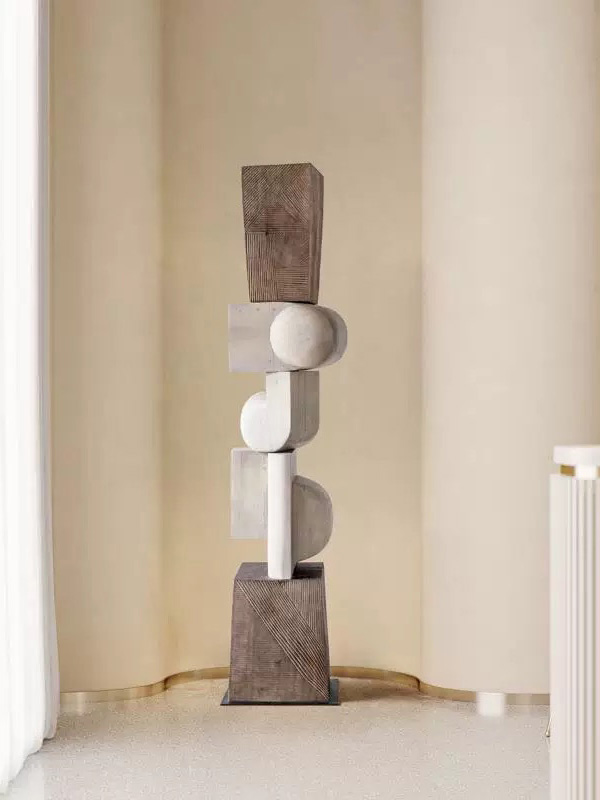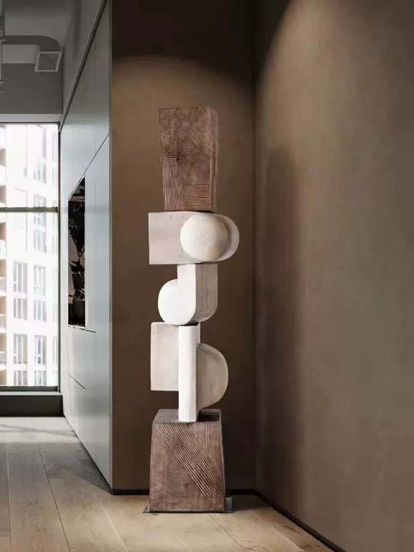 This sculpture is inspired by the concept of balance and structure in modern art. By stacking geometric forms such as cubes and spheres, the piece creates a visual rhythm that feels both stable and dynamic.